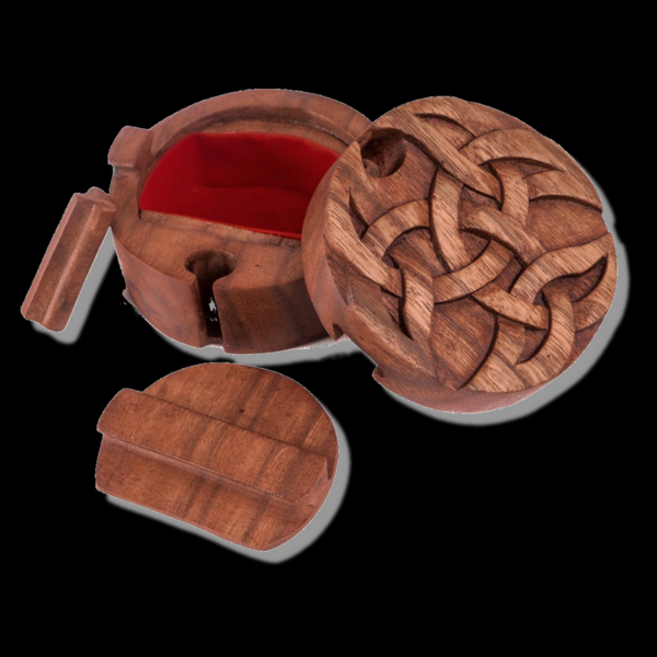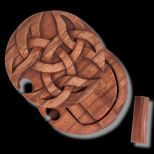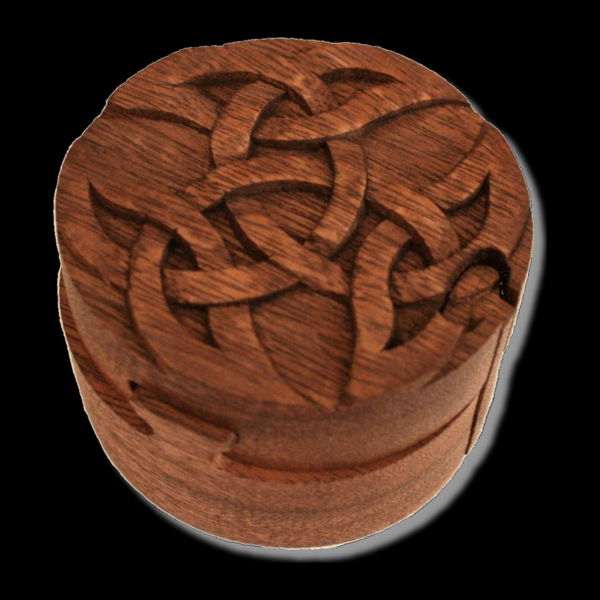 Je zdobená precízne vyrezávaným keltským symbolom Triády na veku.