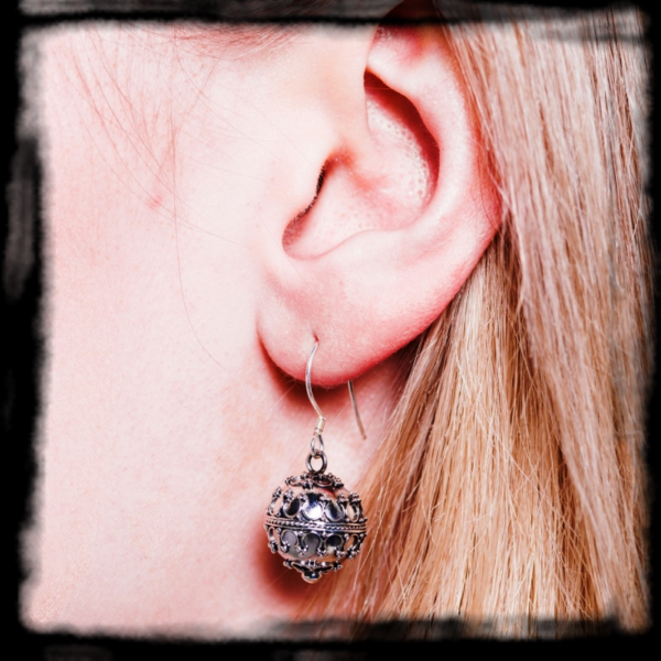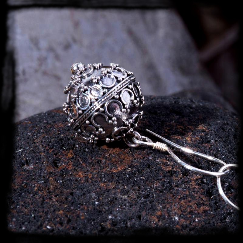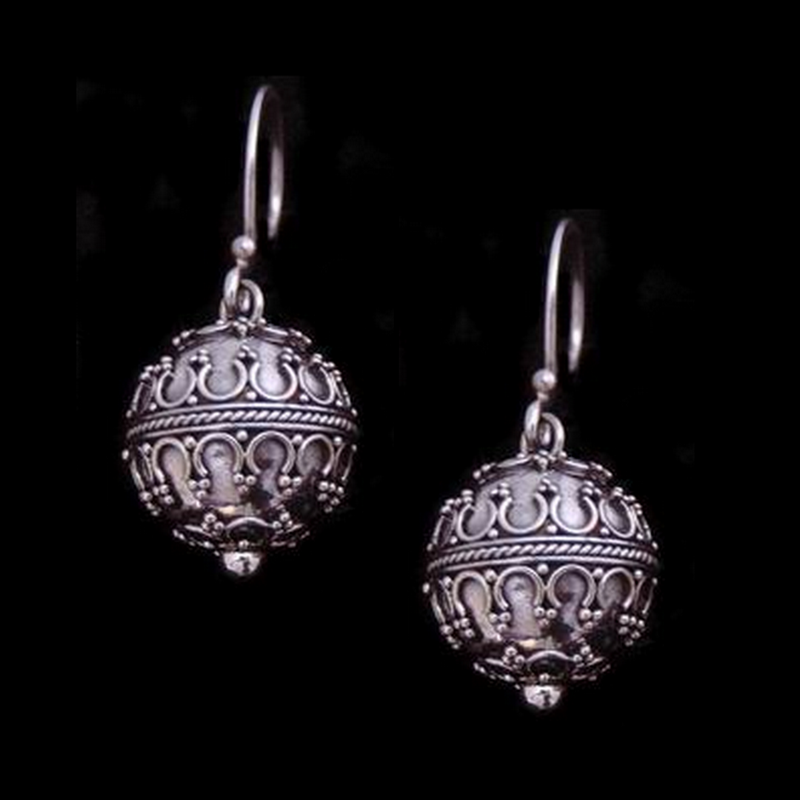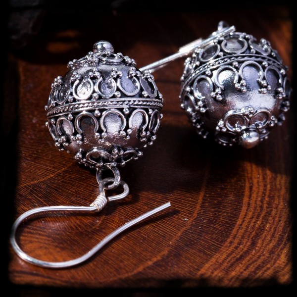 Guľaté a bohato zdobené bubienkové náušnice Balla sú vyhotovené z 925 striebra.