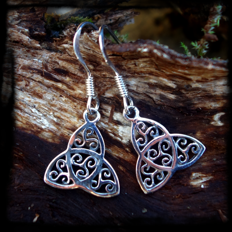 Ľahučké strieborné náušnice v tvare keltského trojuholníka, v ktorom sa vinú štyri symboly Triskelionu.