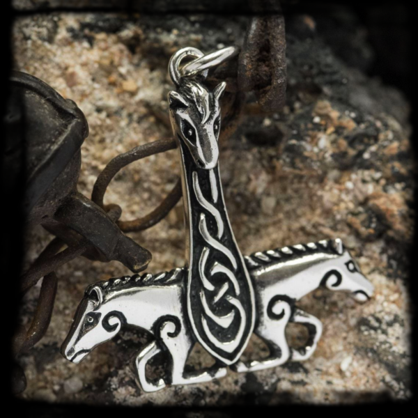 Strieborný vikingský amulet Thorovo kladivo Mjolnir formované z trojice koní.