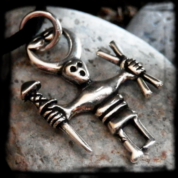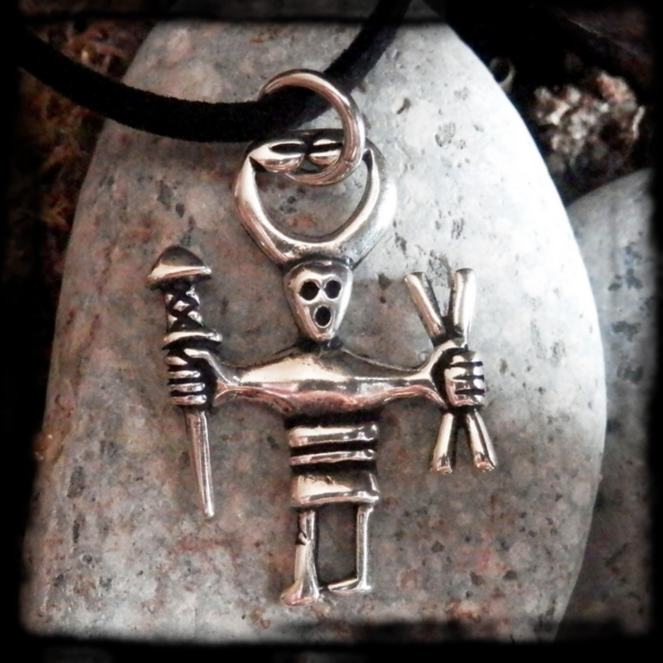 Strieborný amulet Odin v tvare postavy, ktorá v rukách drží magické predmety.